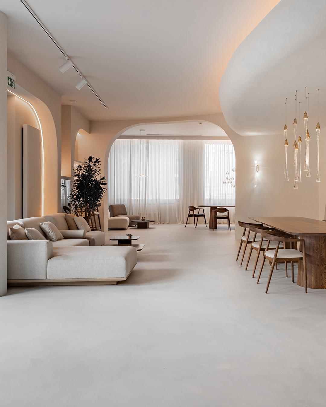 Charakterystyczny układ showroomu — o wydłużonych proporcjach — naturalnie przywodzi na myśl wybieg, co czyni przestrzeń wyjątkowo atrakcyjną dla prezentacji kolekcji.